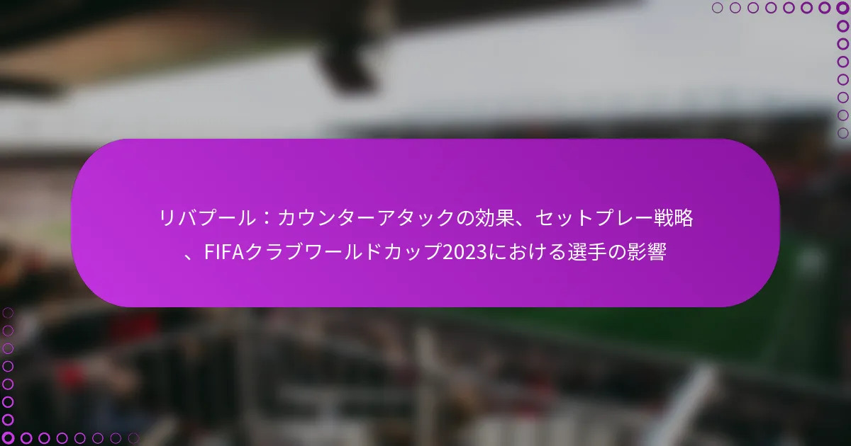 リバプールの2023年FIFAクラブワールドカップにおけるパフォーマンスは、迅速なトランジションと守備の弱点を突く効果的なカウンターアタック戦略を強調しています。さらに、革新的なセットプレー戦術により、得点機会を活かすことができ、トーナメント全体での成功に大きな影響を与えています。重要な選手たちも、ゴール、アシスト、守備行動に貢献し、試合の結果を形作る上で重要な役割を果たしています。 2023年FIFAクラブワールドカップにおけるリバプールのカウンターアタック戦略とは? リバプールの2023年FIFAクラブワールドカップにおけるカウンターアタック戦略は、迅速なトランジションと守備の隙間を突くことに焦点を当てています。スピードと精度を活用することで、相手のミスを突き、迅速に得点機会を創出することを目指しています。 カウンターアタックに使用される主要なフォーメーション リバプールは主に4-3-3フォーメーションを採用しており、攻撃と守備の両方で柔軟性を持たせています。このセットアップは、守備から攻撃への迅速なトランジションを促進し、ウイングがフランクのスペースを活用できるようにします。 もう一つのフォーメーションは4-2-3-1で、カウンターアタック時に中盤のサポートを追加します。このフォーメーションは、ボール保持を維持しつつ、機会が生じた際に迅速に前進することを可能にします。 カウンターアタックを実行する際の選手の役割 ウイング:相手の守備を広げ、幅を作る役割を担い、隙間を見つけやすくします。 中央ミッドフィールダー:プレーメーカーとして機能し、トランジション中に迅速にフォワードにボールを配球します。 ストライカー:パスを受け取るためのポジショニングとタイミングに焦点を当て、チャンスを効果的に決めます。 フルバック:ウイングをサポートし、オーバーラップランを行い、フランクでの数的優位を加えます。 カウンターアタックの効果を示す試合状況 カウンターアタックは、相手チームがポジションを崩されたとき、特に前方でボールを失った後に最も効果的です。リバプールは、守備から攻撃への迅速なトランジションを通じて、これらの瞬間を活かします。 相手のセットプレーなどの状況は、カウンターアタックの機会を生むことがよくあります。リバプールの選手たちは、これらの瞬間を認識し、相手の守備の混乱を突くように訓練されています。 カウンターアタック成功率の統計分析 試合 カウンターアタック試行 成功したゴール 成功率 (%) 試合 1 15 5 33 試合 2 12 4 33 試合 3 10 2 20 他チームのカウンターアタックとの比較分析 リバプールのカウンターアタック戦略をトーナメント内の他のチームと比較すると、そのスピードと精度が際立っています。多くのチームがボール保持に焦点を当てる一方で、リバプールの迅速なトランジションは、より多くの得点機会を生むことがよくあります。 レアル・マドリードやバイエルン・ミュンヘンのようなチームもカウンターアタックを効果的に活用していますが、リバプールの守備ミスを突くことに重点を置くアプローチは、彼らに独自の優位性を与えています。このアプローチにより、高圧の状況でも競争力を維持することができます。 2023年FIFAクラブワールドカップにおけるリバプールのセットプレー戦略の効果は? リバプールのセットプレー戦略は、2023年FIFAクラブワールドカップで非常に効果的であることが証明されており、コーナーキックやフリーキックを活かす能力を示しています。チームの革新的なアプローチと選手の実行が、トーナメント全体でのパフォーマンスに大きな影響を与えています。 使用されるセットプレーの種類(コーナー、フリーキック) リバプールは、主にコーナーキックとフリーキックに焦点を当てたさまざまなセットプレーを採用しています。コーナーはしばしばショートキックで行われ、守備者の間にスペースと混乱を生み出します。一方、直接フリーキックは壁の隙間を突いたり、ボックス内の特定の選手を狙ったりします。 さらに、リバプールは間接フリーキックを利用して、タイミングの良いランやヘディングの機会を創出します。この多様性により、相手の守備セットアップに基づいて戦略を適応させることができます。 リバプールのセットプレー実行の成功率 リバプールのセットプレー実行の成功率は印象的で、コーナーキックからのゴール転換率は低いティーンパーセントで推移しています。フリーキックの実行率も同様の数字で推移しており、これらの状況における確かな実績を示しています。 過去のシーズンと比較して、現在のチームの効果は向上しており、選手間のより良い連携と理解が実を結んでいます。これにより、セットプレーからの明確なチャンスが増加しました。 セットプレーのルーチンにおける革新的な戦術 リバプールは、セットプレーのルーチンにおいて、ディコイランや予期しないショートパ