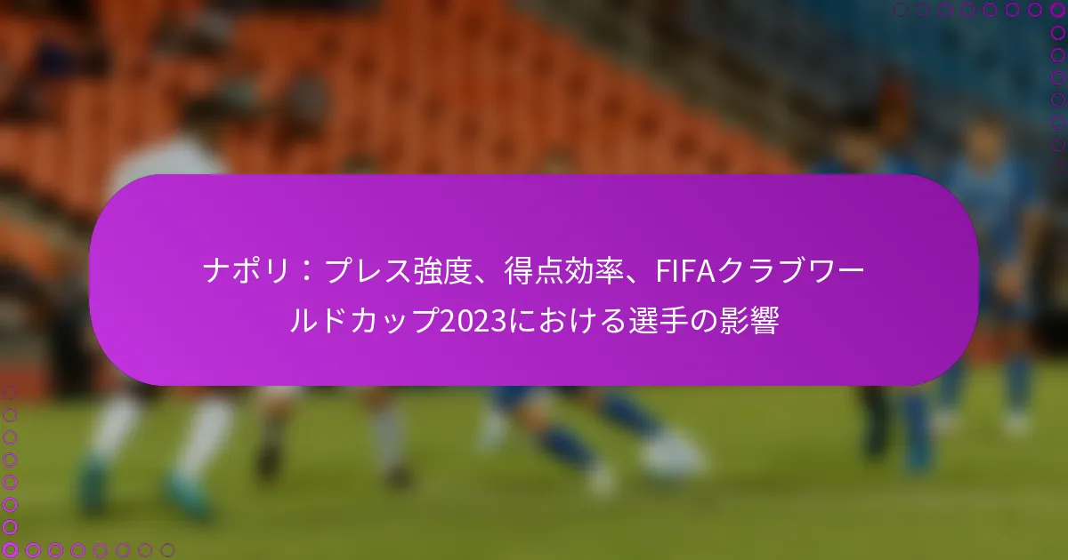 2023年のFIFAクラブワールドカップにおいて、ナポリはプレスの強度と得点効率の見事な組み合わせを示し、ボールを奪い返し得点機会を創出するために攻撃的な戦術を採用しました。チャンスを高い割合でゴールに結びつける能力は、重要な試合での勝利に不可欠であり、際立った個々のパフォーマンスはチーム内の新たな才能の影響を際立たせました。 2023年FIFAクラブワールドカップにおけるナポリのプレス強度とは? 2023年FIFAクラブワールドカップにおけるナポリのプレス強度は、ボールを迅速に奪い返すことを目的とした攻撃的な戦術によって特徴づけられています。このアプローチは彼らのパフォーマンスに大きな影響を与え、相手を妨害し得点機会を創出する能力を示しています。 サッカーにおけるプレス強度の定義 プレス強度とは、相手がボールを保持している際にチームが相手にかける圧力のレベルを指します。これは、スペースを閉じ、ミスを強要し、ボールのコントロールを奪い返すための協調的な努力を含みます。高いプレス強度は、前方のポジションでボールを奪い返すチャンスを増加させることが多いです。 この戦術は、選手が身体的にフィットであり、戦略的に意識を持つことを必要とします。選手は相手の動きを予測し、迅速に反応しなければなりません。効果的にプレスを実施するチームは、ボールの保持を支配し、試合のペースを決定することができます。 プレス強度を測定するための指標 プレス強度を評価するために一般的に使用される指標には、成功したプレスの数、勝利したデュエルの割合、ボールを奪い返すまでの時間が含まれます。これらの指標は、試合中にチームがどれだけ効果的に圧力をかけているかを定量化するのに役立ちます。 成功したプレス: チームが相手にミスを強いることに成功した回数の合計。 勝利したデュエル: チームが勝利したボールの個々の戦いの割合。 ボールを奪い返すまでの時間: チームがボールを失った後、ボールを回復するのにかかる平均時間。 ナポリのプレス強度と他チームの比較 ナポリのプレス強度は、トーナメント内の他のトップチームと比較することができ、彼らの独自のアプローチを際立たせています。多くのチームがプレスを採用していますが、ナポリの戦術は特に攻撃的で、よく調整されています。 チーム 成功したプレス 勝利したデュエル (%) ボールを奪い返すまでの時間 (秒) ナポリ 高い 60%以上 低い10秒台 ライバルチームA 中程度 約50% 1桁分の数分 ライバルチームB 低い 50%未満 高い10秒台 プレス強度が試合結果に与える影響 プレスの強度は試合結果と直接的に相関しており、効果的にプレスをかけるチームはしばしばより多くの得点機会を創出します。相手にミスを強いることで、ナポリはターンオーバーを利用し、それをゴールに結びつけることができました。 さらに、高いプレス強度は相手を疲れさせ、試合後半にミスを誘発することがあります。この戦略はナポリにとって有利であり、試合の流れを支配し続けることを可能にしました。 プレス強度に寄与する重要な選手 ナポリのプレス戦略には、チーム全体の効果を高めるユニークなスキルを持つ数人の重要な選手が不可欠でした。ゲームを読み取り、プレス戦術を実行する能力は、チームの成功にとって重要です。 選手A: 卓越したスピードとスタミナで知られ、選手Aは相手を迅速に閉じ込めるのが得意です。 選手B: 戦術的リーダーである選手Bは、プレスの動きを指揮し、チームの結束を確保します。 選手C: パスをインターセプトする鋭い感覚を持つ選手Cは、成功したプレスの後にカウンターアタックを開始することがよくあります。 2023年FIFAクラブワールドカップにおけるナポリの得点効率はどのくらいでしたか? ナポリは2023年FIFAクラブワールドカップで顕著な得点効率を示し、チャンスのかなりの割合をゴールに結びつけました。この効率は、重要な試合においてチームの成功に直接影響を与えます。 サッカーにおける得点効率の定義 サッカーにおける得点効率は、得点したゴールの数と創出した得点機会の総数の比率を指します。これは、チームがチャンスを実際のゴールに変換する能力を測定するものであり、試合に勝つために重要です。 この指標は通常、パーセンテージで表され、創出されたチャンスのうち何パーセントがゴールに結びついたかを示します。得点効率が高いほど、攻撃が効果的であることを示し、競技トーナメントでの決定的な要因となることがあります。 ナポリの得点と創出したチャンスに関する統計 トーナメント中、ナポリは多数の得点機会を創出し、そのうちのかなりの部分をゴールに結びつけました。彼らの統計は、競合他社と比較して平均以上の得点効率を反映していました。 得点: 約10 創出したチャンス:…