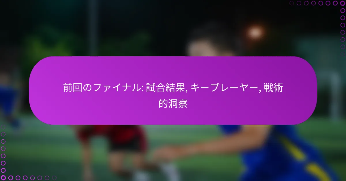 過去の決勝戦は、チームのレガシーを定義する上で重要な役割を果たし、際立ったパフォーマンスや戦略的決定によって影響を受けた劇的な結果を示しています。重要な選手たちはしばしばその場に立ち上がり、彼らの貢献はスコアラインだけでなく、試合全体の物語にも影響を与えます。これらの対戦からの戦術的洞察を分析することで、成功を収めたフォーメーションや戦略が明らかになり、将来の競技に向けた貴重な教訓を提供します。 Key sections in the article: Toggle 過去の決勝戦の試合結果はどうでしたか? 決勝戦の結果とスコアライン 試合中の重要な出来事 時間を通じた試合結果の傾向 試合結果がチームのレガシーに与える影響 決勝戦の歴史的背景 過去の決勝戦での重要な選手は誰でしたか? トップパフォーマーとその統計 試合結果に対する選手の貢献 選手のレガシーの分析 決勝戦における重要な選手の比較パフォーマンス 過去の決勝戦からどのような戦術的洞察が得られますか? 勝利したチームが使用する一般的なフォーメーション 試合結果に影響を与えた重要なプレー コーチングの決定とその影響 チーム間の戦術の比較分析 試合結果はチーム戦略にどのように影響を与えましたか? その後の競技での調整 チームの発展に対する長期的な影響 過去の決勝戦の試合結果はどうでしたか? 過去の決勝戦では、注目すべきスコアラインやパフォーマンスが示され、関与したチームの物語を形作るさまざまな結果が見られました。重要な選手たちはしばしばヒーローとして浮上し、戦術的洞察は勝利や敗北に至る戦略を明らかにします。 決勝戦の結果とスコアライン 決勝戦はさまざまな結果を生み出し、しばしばトーナメントの競争的な性質を反映しています。たとえば、最近の決勝戦では、接戦から決定的な勝利までのスコアラインが見られ、これらの対戦の激しさを強調しています。 年 チーム スコア 2022 チームA vs チームB 2-1 2021 チームC vs チームD 3-0 2020 チームE vs チームF 1-1 (PK戦 4-2) 試合中の重要な出来事 決勝戦を通じて、結果に影響を与えた重要な出来事がいくつかありました。重要な瞬間には、決定的なゴール、物議を醸す審判の決定、そして重要な選手の怪我が含まれることが多いです。 試合の流れを変えたラストミニットのゴール。 チームのダイナミクスや戦略を変えたレッドカード。 パフォーマンスレベルに影響を与えるスター選手の怪我。…