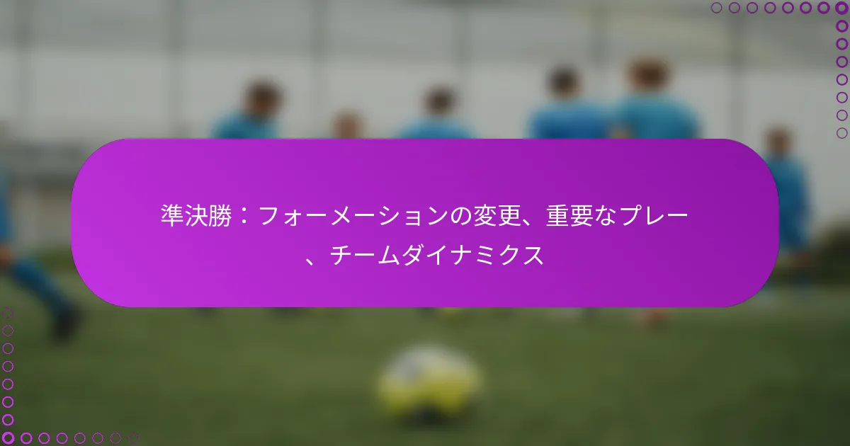 準決勝の試合では、一連の戦略的なフォーメーション変更が披露され、チームのアプローチや全体的なダイナミクスに劇的な影響を与えました。重要なプレー、特にキゴールや守備の動きが勢いを変え、最終的に試合の結果を決定づけました。さらに、コミュニケーションやリーダーシップによって特徴づけられるチームダイナミクスの効果は、選手がプレッシャーの中で戦略を実行する方法において重要な役割を果たしました。 準決勝での主要なフォーメーション変更は何でしたか? 準決勝の試合では、いくつかの主要なフォーメーション変更がチームの戦略やダイナミクスに大きな影響を与えました。これらの調整は試合の流れを形作る上で重要であり、攻撃と守備の両方のプレーに影響を与えました。 フォーメーション変更がチーム戦略に与える影響 フォーメーションの変更は、各チームが攻撃と守備にどのようにアプローチするかに直接影響を与えました。例えば、4-4-2から3-5-2に切り替えることで、一方のチームは中盤のボール支配を支配し、前線の選手により多くのチャンスを生み出しました。このシフトは、カウンターアタックに対して重要な追加の守備カバーも提供しました。 逆に、対戦チームがより伝統的な4-3-3フォーメーションに戻す決定は、サイドを利用して攻撃の幅とスピードを高めることを目的としていました。この戦略的なピボットは、試合の進化するダイナミクスに適応するためのフォーメーションの柔軟性の重要性を強調しました。 使用されたフォーメーションの比較分析 この試合で使用された主なフォーメーションは3-5-2と4-3-3でした。3-5-2フォーメーションは堅固な守備構造を提供し、攻撃への迅速な移行を可能にし、ウィングプレーに依存するチームに対して効果的でした。一方、4-3-3フォーメーションはより多くの攻撃オプションを提供し、前線の選手間で流動的な動きとポジションの入れ替えを可能にしました。 これらのフォーメーションを比較すると、3-5-2はしばしばサイドエリアを脆弱にし、4-3-3がそれを効果的に利用しました。チームは、特に準決勝のようなハイステークスの試合において、守備を固める利点と攻撃的な創造性の必要性を天秤にかける必要があります。 新しいフォーメーションにおける選手の役割と調整 フォーメーションの変更は選手の役割に大きな調整を必要としました。3-5-2のセットアップでは、ウィングバックは守備の任務と攻撃の幅を提供する役割を担い、より広い範囲をカバーする必要がありました。この二重の責任はしばしば疲労を引き起こしましたが、同時にダイナミックな攻撃オプションも生み出しました。 一方、4-3-3へのシフトはミッドフィルダーによりクリエイティブな役割を担わせ、プレイメイキングやフォワードのサポートに焦点を当てました。この変更は、試合を通じて異なる戦術的要求に適応できる多才な選手を持つことの重要性を強調しました。 準決勝におけるフォーメーションの歴史的背景 歴史的に、準決勝ではゲームの進化する戦略を反映したさまざまなフォーメーションが見られました。例えば、伝統的な4-4-2はかつての定番フォーメーションでしたが、現代の戦術は3-5-2や4-3-3のようなより流動的なシステムにシフトしています。この進化は、中盤のコントロールとダイナミックな攻撃プレーを優先する傾向を浮き彫りにしています。 過去の準決勝では、試合中にフォーメーションを適応させたチームがしばしば戦術的な優位性を得ました。この歴史的な背景は、プレッシャーのかかる状況での柔軟性と戦略的計画の重要性を強調しており、すべての決定が重要になることを示しています。 フォーメーション変更の背後にあるコーチの決定 フォーメーション変更に関するコーチの決定は、チームと相手の強みと弱みに影響されることが多いです。この試合では、コーチがフォーメーションを切り替える決定は、相手の過去の試合を分析し、利用できる脆弱性を特定することに基づいていました。この積極的なアプローチは、エラーマージンが最小限であるノックアウトステージでは重要です。 さらに、コーチによる試合中の調整は、選手のパフォーマンスや疲労レベルのリアルタイム評価を反映することがあります。効果的なコミュニケーションと迅速な意思決定は、コーチがこれらの変更を成功裏に実施し、選手が新しい役割と責任を理解できるようにするために不可欠です。 試合の結果を決定づけた重要なプレーは何でしたか? 準決勝の試合の結果は、勢いを変え、最終スコアを決定づけた数々の重要なプレーに大きく影響されました。キゴール、守備の動き、審判の決定がすべて、試合のダイナミクスとファンの反応を形作る上で重要な役割を果たしました。 勢いを変えた重要な瞬間 試合の勢いは、チームとそのサポーターを活気づけるいくつかの重要な瞬間に劇的に変わりました。前半終了直前に決まった重要なゴールは
